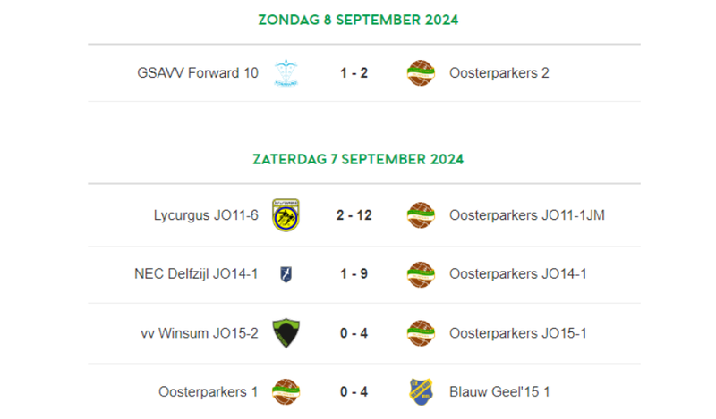Het was voor de jeugd weer genieten om op de vroege zaterdagochtend te mogen voetballen. Met drie knappe overwinningen en één grote nederlaag zijn de jonge Oosterparkers het seizoen goed begonnen. In Noordwolde ging de ploeg van Rene Schat helaas fors onderuit met maar liefst 2-12. Het nieuwe JO8 team had het dus lastig tegen de leeftijdsgenoten van Noordwolde maar bleven dapper strijden. Het JO11 team van Marion Reinders had geen kind aan Lycurgus JO11-6. In Vinkhuizen scoorden de groenhemden in een uiterst sportieve wedstrijd maar liefst 12 keer en dat beloofd veel goeds voor de rest van het seizoen. Ook de jeugd uitkomend in JO14 is een nieuw team dit seizoen en onder leiding van trainer Richard Schutter gaf de ploeg direct zijn visitekaartje af. In Delfzijl versloegen de groenwitten NEC Delfzijl JO14-1 met maar liefst 1-9. Er druppelde rond het middaguur nog meer goed nieuws binnen bij de Oosterparkers. Het JO15 elftal van Johan Reinders wist in de 1e klasse Winsum te verslaan met een keurige 0-4 overwinning. Dit onder meer door twee werelddoelpunten van Damian Tiebackx en Finn Reinders.