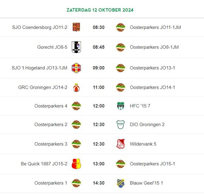 Dit weekend voor de jeugd allemaal uitwedstrijden op het programma en voor Oosterparkers JO11 betekent dit een treffen met SJO Coendersborg om half 9. Het team van Marion Reinders heeft dit seizoen drie keer gewonnen en twee verloren maar treft zaterdag wel de koploper in Coendersborg. De tegenstander van de groenhemden hebben tot nu alles gewonnen met maar liefst 34 doelpunten voor en slechts 1 doelpunt tegen. In Haren is het om kwart voor 9 de beurt aan de talenten van JO8-1 die daar de leeftijdsgenoten van Gorecht treffen. Het seizoen verloopt voor de jongens van Rene Schat erg wisselvallig waarbij mooie overwinningen worden afgewisseld met fikse nederlagen. De groen-witten gaan er in ieder geval weer een spektakel van maken aankomende zaterdag! Voor het 8-tal van Oosterparkers JO13 verloopt het seizoen tot nu toe erg stroef en staat het met 0 punten onderaan de ranglijst. Hoewel het spel per week verbetert is het wachten op het eerste resultaat voor het team van Arie van Kampen. In Warffum speelt het om 9 uur tegen SJO 't Hogeland JO13-1. Het team van Richard Schutter speelt op papier de uitwedstrijd bij GRC op Corpus den Hoorn maar wegens capaciteit problemen wordt die wedstrijd verplaatst naar Kardinge. De groenhemden spelen nu dus een thuiswedstrijd en hopen dit om te kunnen zetten in winst tegen GRC Groningen JO14-2. In de middag is het pas de beurt aan onze oudste jeugd want Oosterparkers JO15-1 speelt om 13:00 uur op de Esserberg tegen Be Quick JO15-2. Het duel zal voor de jongens van Johan Reinders een pittige opgave worden want de thuisploeg staat op een keurige 2e plek. Bij winst doen de groenhemden uitstekende zaken want dan zal het op gelijke hoogte komen met de Harenaren.