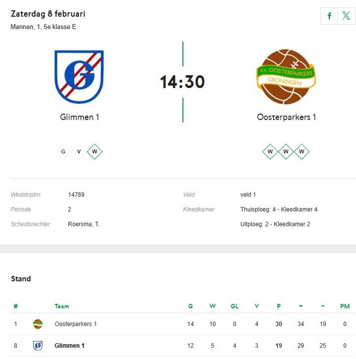 Deze zaterdag gaan de heren van het 1e elftal op bezoek in Glimmen en treffen daar de nummer 8 van de ranglijst. Na de winterstop wisten de groenhemden tot nu toe alle wedstrijden te winnen en ook in Glimmen zullen alleen de drie punten voor tevreden gezichten zorgen. In de race om het kampioenschap kan de ploeg van Sportpark Kardinge zich haast geen misstappen meer permitteren en zal dus zaterdag vol voor de winst de gaan. Met een nagenoeg complete wedstrijdselectie gaan de stadjers op volle oorlogssterkte richting Glimmen. In de eerste wedstrijd op Kardinge ging het finaal mis voor de Oosterparkers en verloor het de wedstrijd met 0-2 van de Glimmenaren. Sinds die wedstrijd in eind september is er echter veel veranderd en gezien de huidige vorm van beide ploegen zal Oosterparkers de rol van favoriet moeten gaan waarmaken. In 2025 wist de tegenstander vlak onder Haren alleen nipt te winnen van Tynaarlo, verloor het thuis van Blauw Geel en pakte het vorige week een punt bij VVK. De ploeg van Peter Slijfer deed het een stuk beter en won zowel van LEO, GEO als Asser Boys. De wedstrijd op Sportpark de Groenenberg in Glimmen begint om half 3.