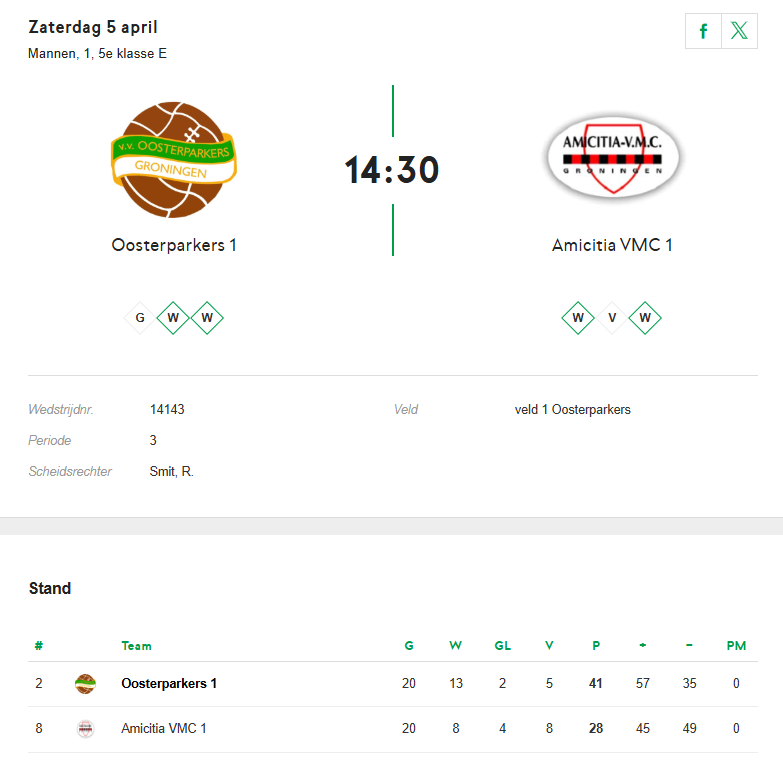 Het prachtige voetbalgevecht van vorige week in de topper tegen VAKO heeft beide clubs veel complimenten opgeleverd alleen hadden de Oosterparkers er eigenlijk met drie punten van door moeten gaan. Hoewel de beste papieren voor het kampioenschap bij de Vriezenaren liggen zullen de groenhemden er daarentegen alles aan moeten doen om zichzelf te verzekeren van de 2e plek, Deze zaterdag komen de heren van Amicitia op bezoek en aan die wedstrijd hebben de Oosterparkers eerder dit seizoen mooie herinneringen aan. De eerste periodetitel werd in Coendersborg onder luid gejuich van de Oosterparkers aanhang binnengesleept waarna een prachtig feest losbarstte. Op Sportpark Kardinge zal de ploeg van Peter Slijfer aan zijn stand verplicht zijn om de drie punten in eigen huis te houden. Na afloop zullen de ogen ook zeker gericht zijn op de uitslagen van de andere velden want nog niets is zeker in de 5e klass E. De aftrap op Kardinge is om half 3 en de wedstrijdbal wordt aangeboden door Johan van Linschoten.