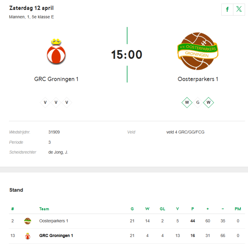 Dit weekend staat er voor het vlaggenschip de wedstrijd tegen GRC op het programma en dit keer spelen de groenhemden op Corpus den Hoorn. De eerste wedstrijd op Kardinge was op het kunstgrasveld van GVAV op een ijzige decembermiddag die uiteindelijk nipt met 3-2 werd gewonnen. In de rust gingen de mannen van Peter Slijfer met een comfortabele 3-0 voorsprong aan de thee maar na rust moest het nog vechten voor de drie punten. De GRC'ers hebben de laatste drie wedstrijden verloren en verkeren momenteel niet in topvorm waardoor ze terug te vinden zijn op de laatste plekken van ranglijst. De groenhemden hebben daarentegen een goede reeks neergezet en staan momenteel nog op de gedeelde 1e plek. Het enige wat telt voor de ploeg van Sportpark Kardinge zijn de drie punten om de druk op koploper VAKO te houden en de comfortabele voorsprong op plek 3 niet te laten slinken. De aftrap in Corpus den Hoorn is om 15:00 uur.