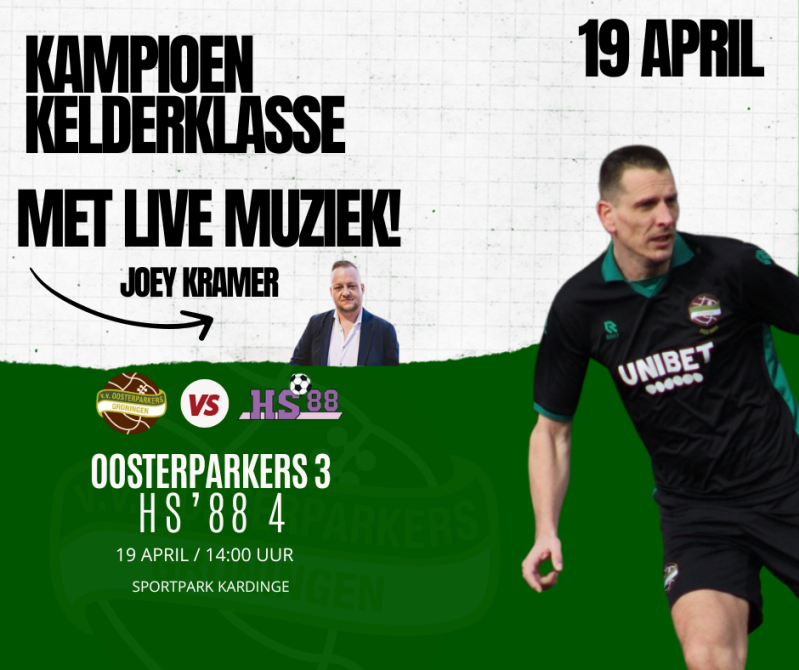 In de reserve 6e klasse lijkt het er sterk op dat Oosterparkers 3 moeiteloos de titel grijpt. Het elftal van leider Martin Ludolphy heeft tot nu toe alle wedstrijden gewonnen en staan eenzaam bovenaan de ranglijst. De groenhemden waren vorig jaar al dichtbij maar moesten toen in de laatste weken een pas op de plaats doen. Dit seizoen lijkt er geen vuiltje aan de lucht want de concurrentie staat mijlenver achter. Dit weekend ontvangt het HS' 88 4 en kan het bij winst en gunstige uitslagen op de andere velden zich officieel kampioen van de Kelderklasse noemen. De wedstrijd op Kardinge begint om 14:00 uur en na afloop is er hoe dan ook live muziek in de kantine. Er wordt door hoofdsponsor Veronica Bar namelijk ook al een warming-up feestje gegeven voor het grote Veronica Voetbalfeest op 24 mei! Vanaf 17:00 uur neemt Joey Kramer de muzikale noten voor zijn rekening en kunnen de Oosterparkers zich opmaken voor mooi en gezellig paasweekend. Uiteraard is iedereen welkom en hopen de mannen van zaterdag 3 op genoeg steun in de zoektocht naar het allereerste kampioenschap.