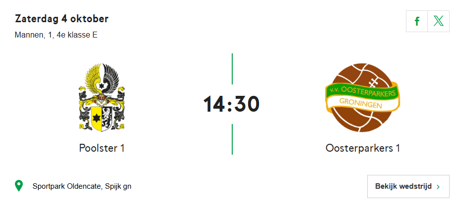 Oosterparkers 1 speelt in de derde competitieronde opnieuw een uitwedstrijd. Ditmaal is Poolster uit Spijk de tegenstander. De ploeg van trainer Peter Slijfer hoopt de uitstekende competitiestart een goed vervolg te geven. Met twee gespeeld, zes punten is er tot dusver weinig reden tot klagen bij de groenhemden.De ploeg uit Spijk begon het seizoen met een gelijkspel tegen Mamio en een ruime overwinning op Noordwolde. Het belooft een pittige middag te worden: de weersvoorspelling spreekt van stormachtige omstandigheden, en in de provincie kunnen de stadjers zich opmaken voor een strijdlustige tegenstander. De aftrap in Spijk is om 14:30 uur.