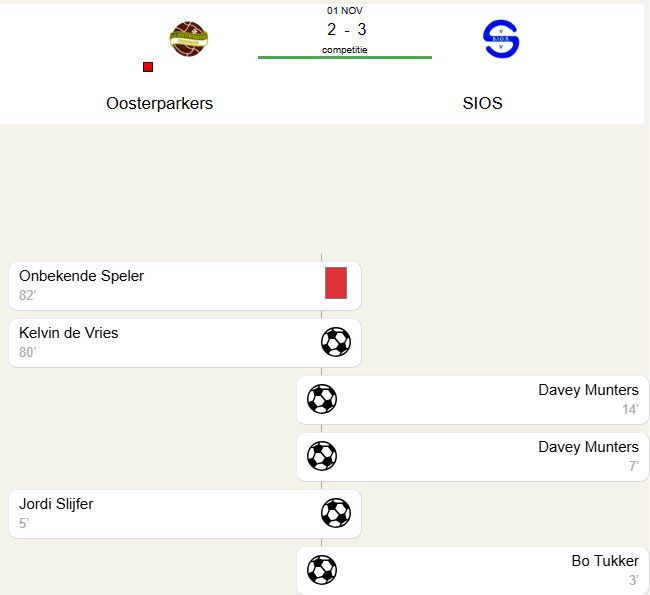 De wedstrijd begon echter rampzalig voor de thuisploeg. Na amper twee minuten profiteerde SIOS van slap verdedigen en zette de 0-1 op het bord. Gelukkig bracht Jordi Slijfer zijn team kort daarna op gelijke hoogte door een corner knap binnen te werken: 1-1. Toch bleef het defensief onrustig bij Oosterparkers; SIOS combineerde eenvoudig door de linies heen en liep nog voor rust uit naar 1-3. Daan van der Meulen was nog dicht bij de aansluitingstreffer, maar zijn inzet belandde op de paal.