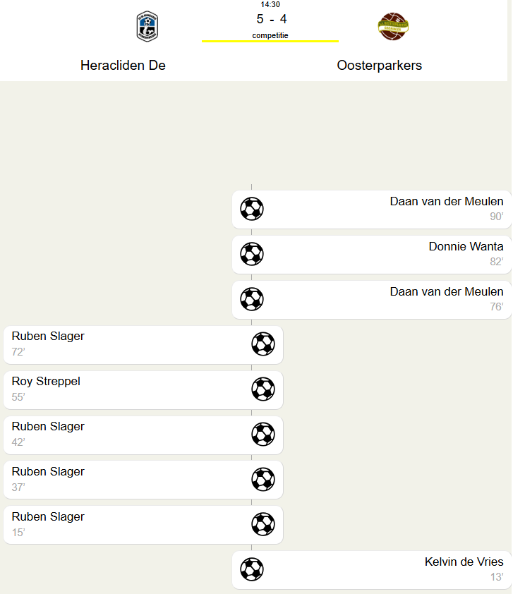 Na rust werd het spelbeeld er niet beter op voor Oosterparkers. De Heracliden profiteerde volop van de geboden ruimte en liep uit naar 5-1. Pas in de slotfase kwamen de bezoekers tot leven: Daan van der Meulen (2x) en Donny Warta brachten de spanning nog even terug tot 5-4, maar verder kwam de ploeg niet.