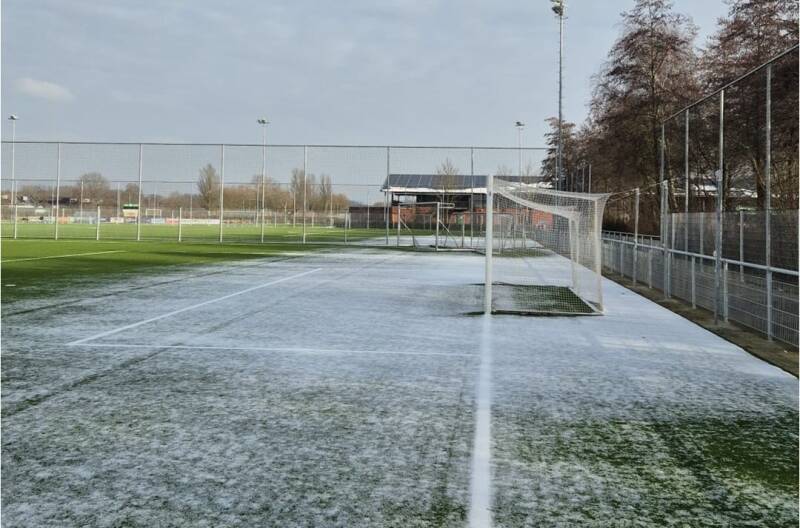Aan de zuidkant van de kunstgrasvelden ligt nog een dun laagje sneeuw (tot ongeveer 5 meter vanaf de achterlijn).