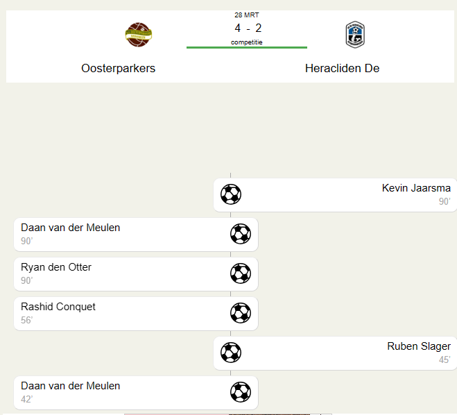 Oosterparkers 1 speelde afgelopen zaterdag een cruciale wedstrijd tegen De Heracliden 1. Gezien de stand op de ranglijst was het belang van de drie punten direct duidelijk voor de ploeg van trainer Peter Slijfer. De gevreesde tiende plek – die nacompetitie betekent – moest koste wat kost worden vermeden. De Heracliden stond vooraf met vier punten voorsprong één plek boven Oosterparkers, dat op plaats 11 bivakkeert met alleen Mamio nog onder zich. De opdracht was dus helder: alleen winst zou tevreden gezichten opleveren.